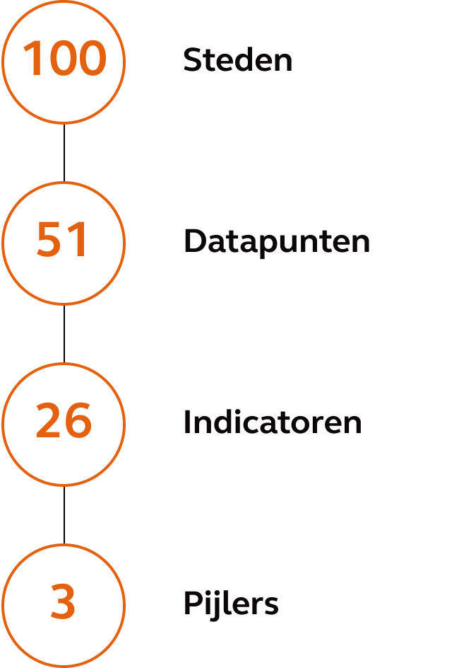 Bekijk de resultaten hieronder en ontdek de 20 steden aan de top van de algemene index en de steden die het best scoorden op de drie afzonderlijke pijlers.